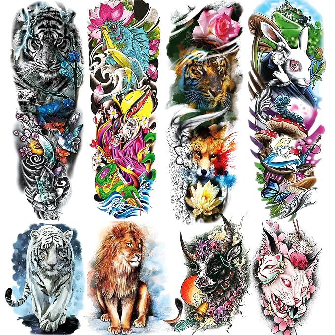 Amazon Com Wild Animal Temporary Tattoos Sleeve 4 Sheet Large Lion Arm Temporary Tattoos And 4 Sheet Fake Tiger Rabbit Fish Full Arm Sleeve Tattoo Sticker For Women Men Beauty Personal Care